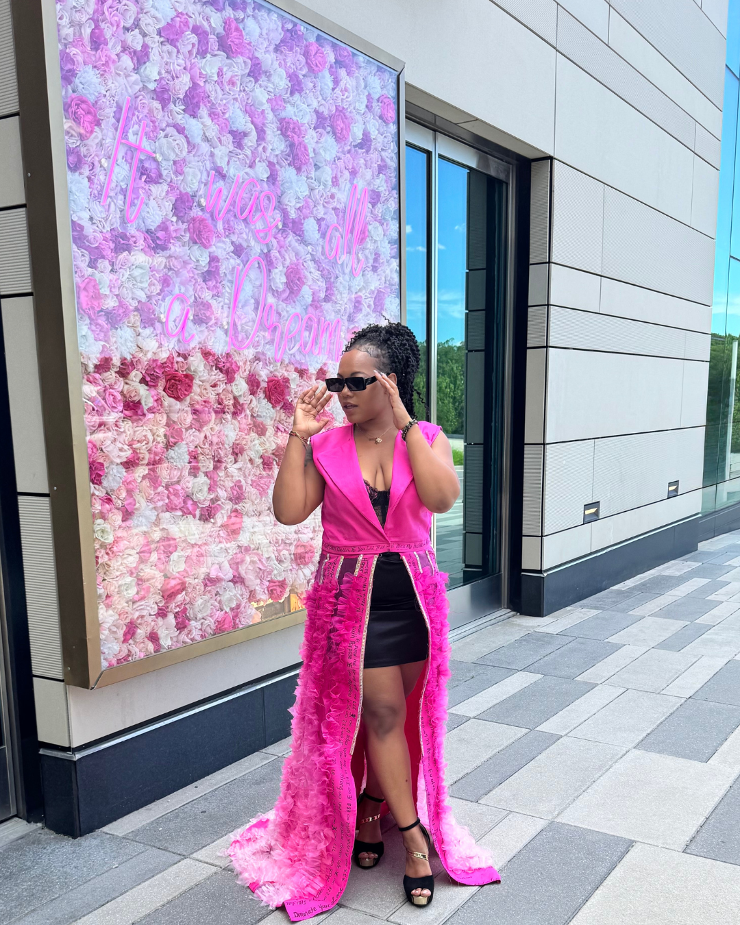 The Phoenix Rising Denim Dress is a one-of-a-kind couture piece handcrafted with layers of ombré ruffles, gold accents, and handwritten affirmations — each word a reminder of resilience. Designed for transformation, this look features a fully detachable ruffle train that allows you to shift from statement glamour to refined elegance with ease.