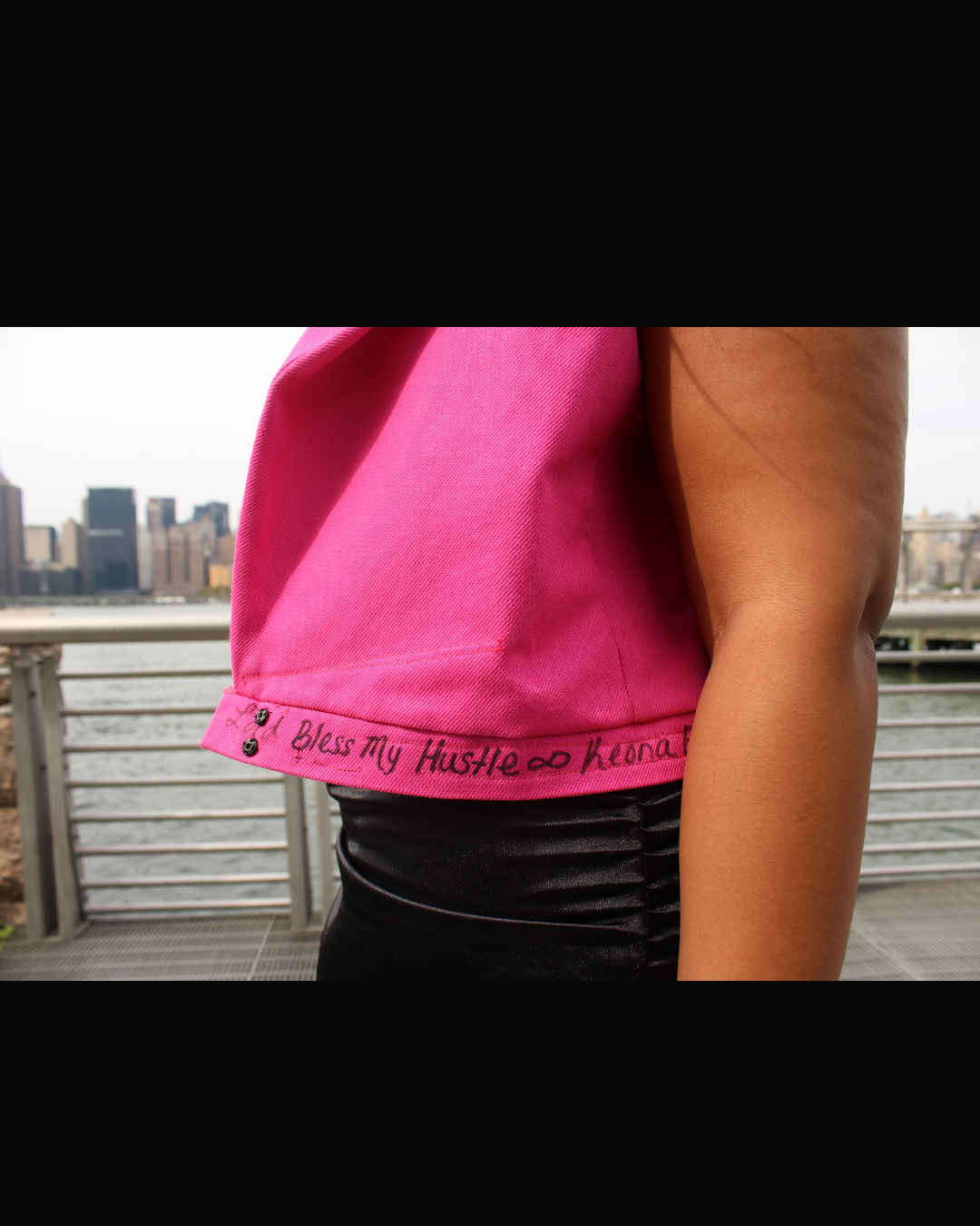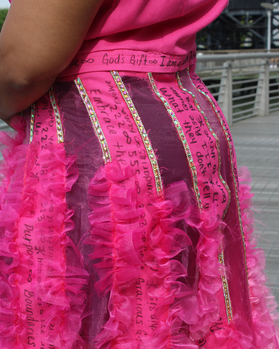 Each affirmation is written by hand, infusing the garment with intention and emotional energy — turning healing into haute couture.