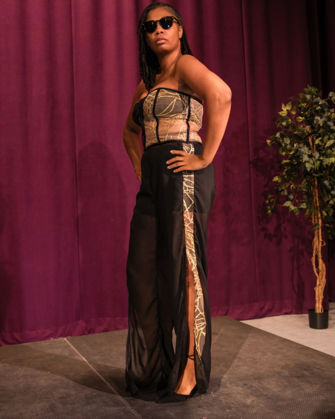 Crafted from sheer stretch mesh embroidered with gold vine detailing, this couture piece symbolizes growth, resilience, and evolution. The strategically placed boning creates a snatched silhouette, while the asymmetrical design adds a seductive, modern edge.